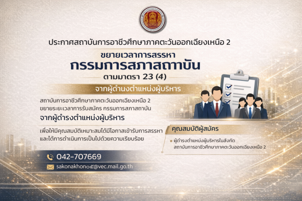 ประกาศสถาบันการอาชีวศึกษาภาคตะวันออกเฉียงเหนือ 2 ขยายเวลาการสรรหากรรมการสภาสถาบัน ตามมาตรา 23 (4) จากผู้ดำรงตำแหน่งผู้บริหาร