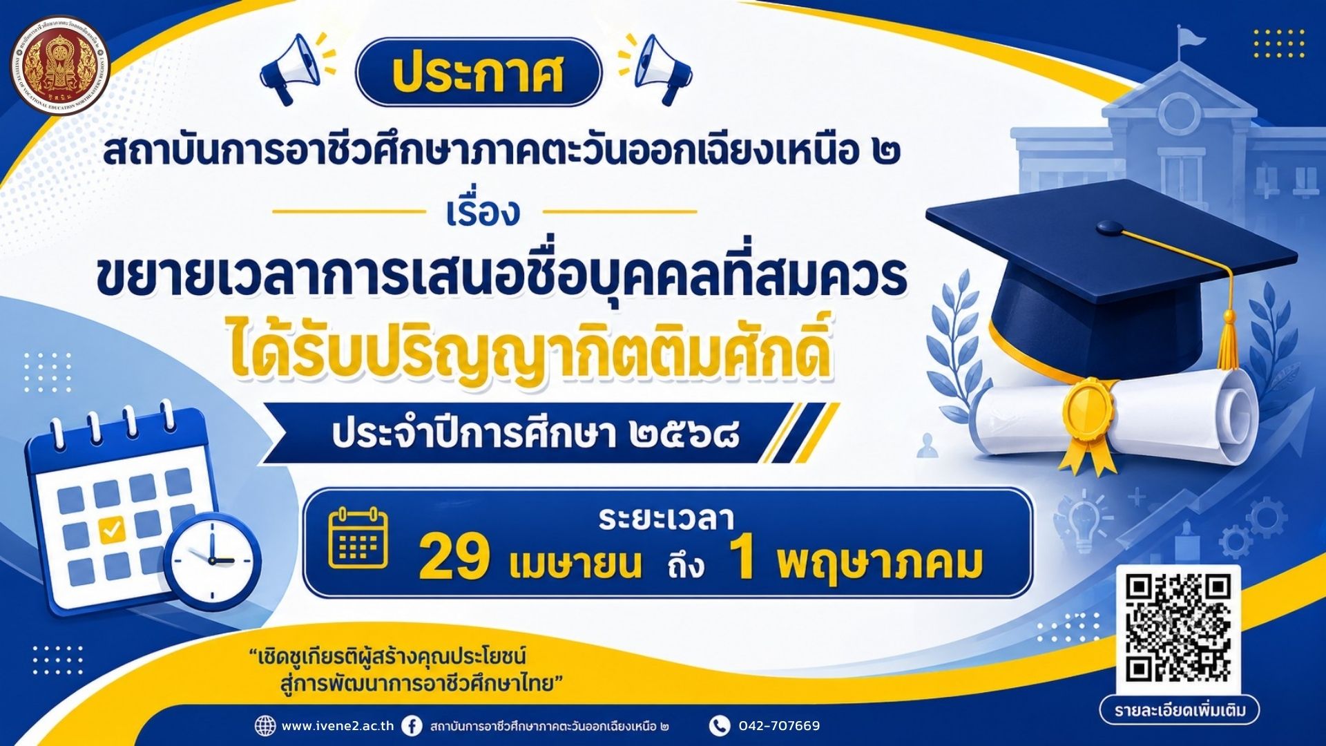 สถาบันการอาชีวศึกษาภาคตะวันออกเฉียงเหนือ ๒ ขอประชาสัมพันธ์การขยายระยะเวลาการเสนอชื่อบุคคลที่สมควรได้รับปริญญากิตติมศักดิ์ ประจำปีการศึกษา ๒๕๖๘ เพื่อเปิดโอกาสให้หน่วยงานและผู้มีส่วนเกี่ยวข้องสามารถเสนอชื่อบุคคลผู้มีคุณูปการต่อสังคมและประเทศชาติได้อย่างทั่วถึงมากยิ่งขึ้น